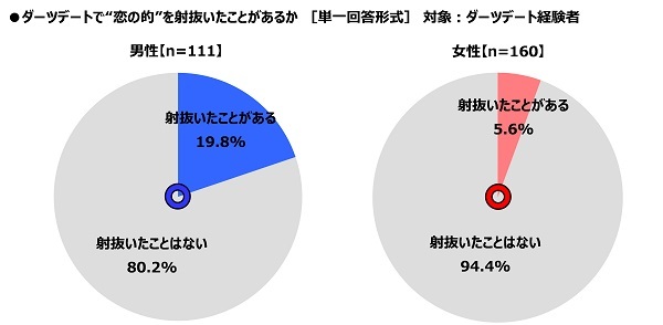 続いて、ダーツデート経験者(男性111名、女性160名)に、ダーツデートで“恋の的”を射抜いたことがあるか聞いたところ、「射抜いたことがある」が男性では19.8%、女性では5.6%となりました。