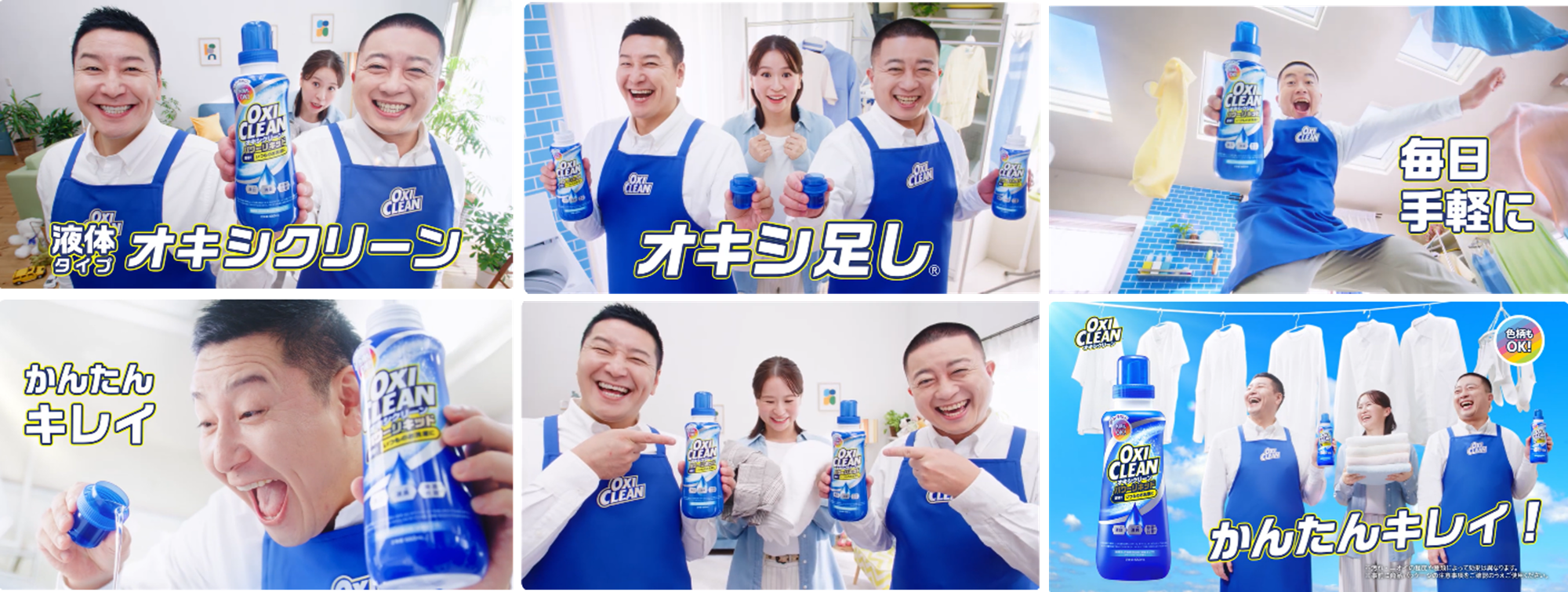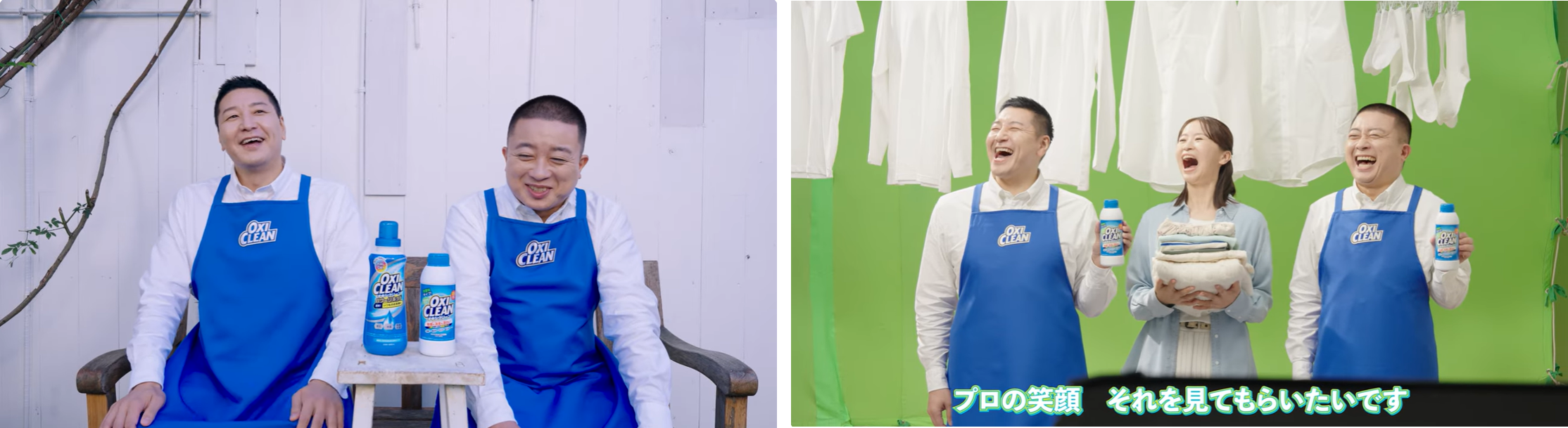 今回のCMはチョコレートプラネットのお2人が登場し、家庭の洗濯で多くの人が悩む「エリそで汚れ」「食べこぼし」「泥汚れ」などの頑固な汚れを、粉末タイプによる“オキシ漬け”で解決する様子を描きます。