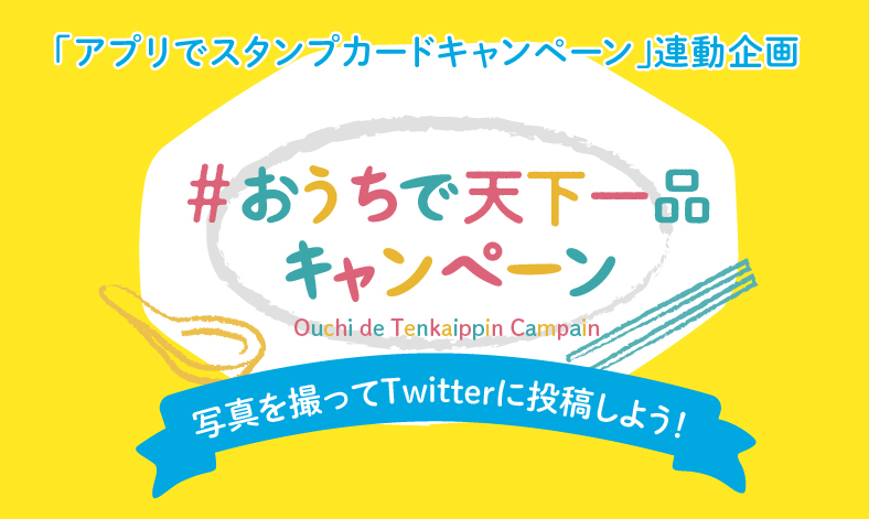 天下一品公式Twitter(@1971tenkaippin)をフォローし、指定ハッシュタグ「#おうちで天下一品」をつけて、スタンプカードキャンペーンで手に入れた天下一品オリジナル食器を使った写真を投稿いただくと、投稿者の中から抽選で10名様に家麺2食セットがもらえるキャンペーン