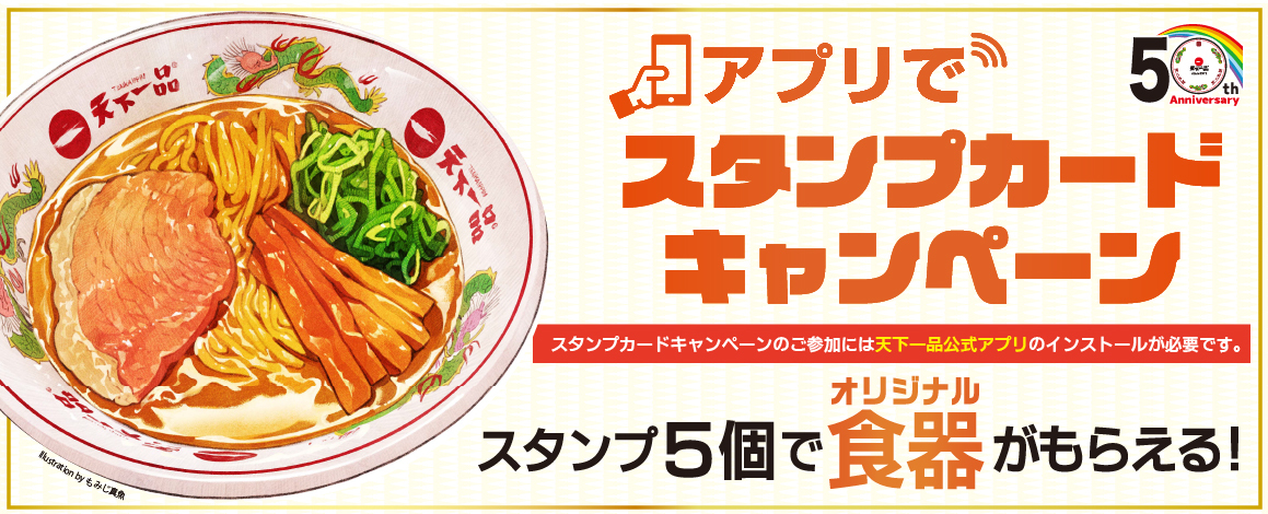 スタンプカードキャンペーンは、天下一品公式アプリをインストールいただき、店内にてラーメンをご注文いただくことで、ご参加いただけます。天下一品公式アプリにてスタンプを5個集めると、「天下一品オリジナル食器」もしくは、次回ご来店時にご利用いただけるラーメン(並)1杯半額クーポン、どちらかをお選びいただけます。
