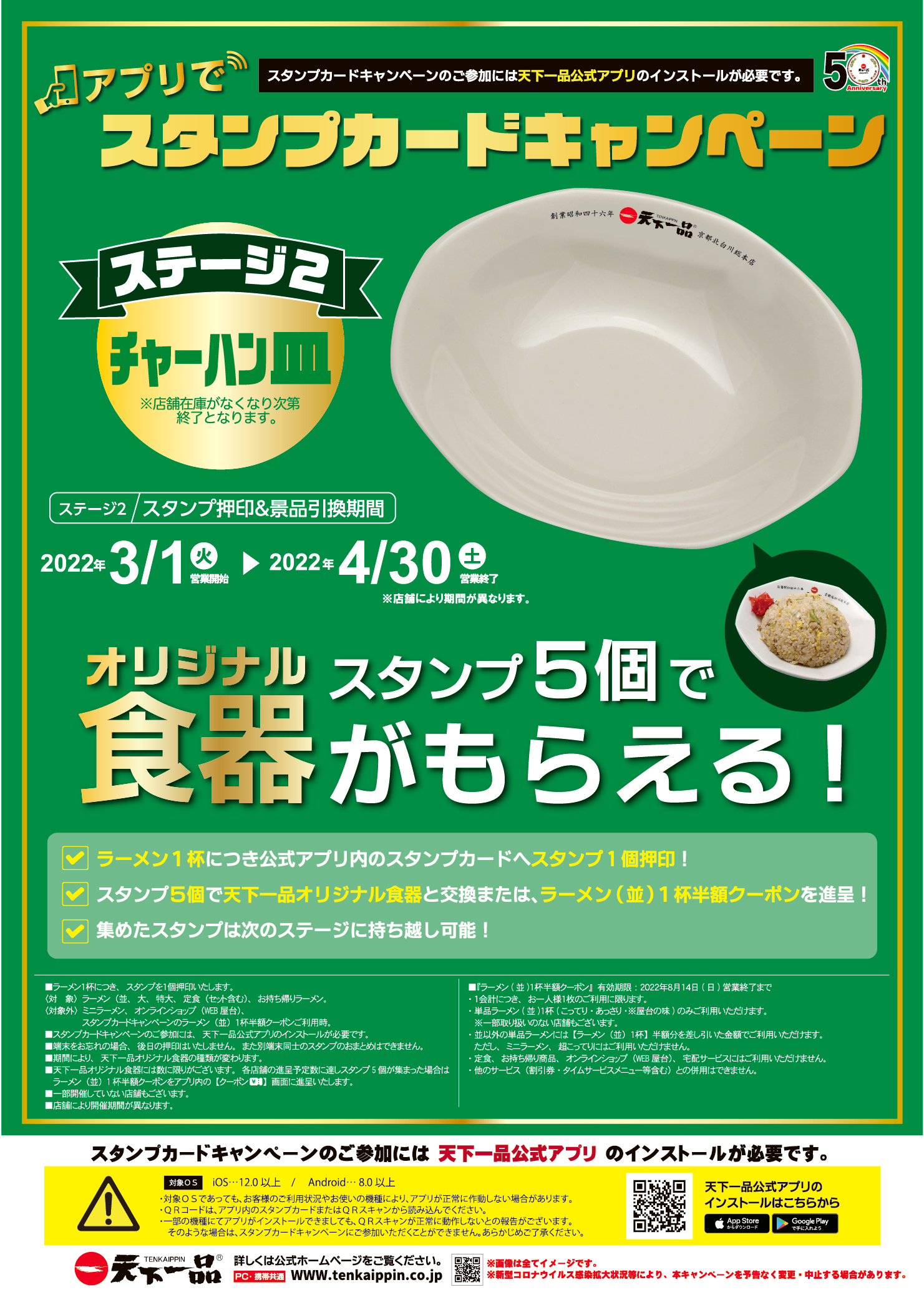 スタンプ5個で天下一品オリジナル食器がもらえる! 『アプリでスタンプカードキャンペーン』ステージ2が 3月1日からスタート!