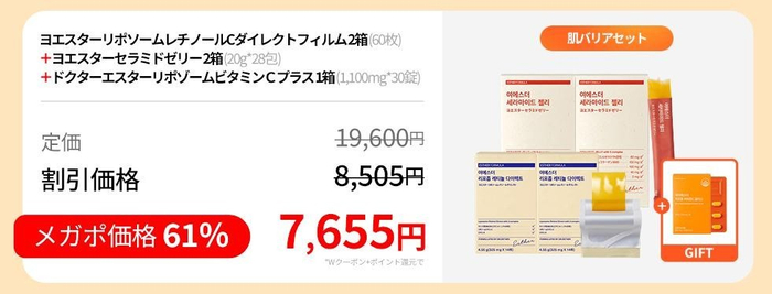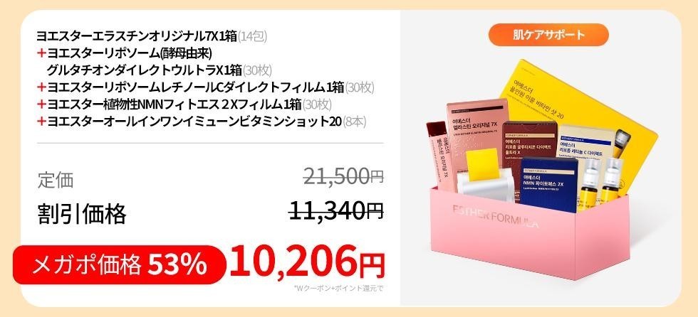 今回は、通常の2箱セットに加え、みりんさんスペシャルコラボ企画として「ヨエスターエラスチンオリジナル7X」2箱を無料で贈呈するお得なセットをご用意しました。さらに、初コラボを記念してこのセット限定の15%オフクーポンを提供中です。この機会にぜひお試しください!