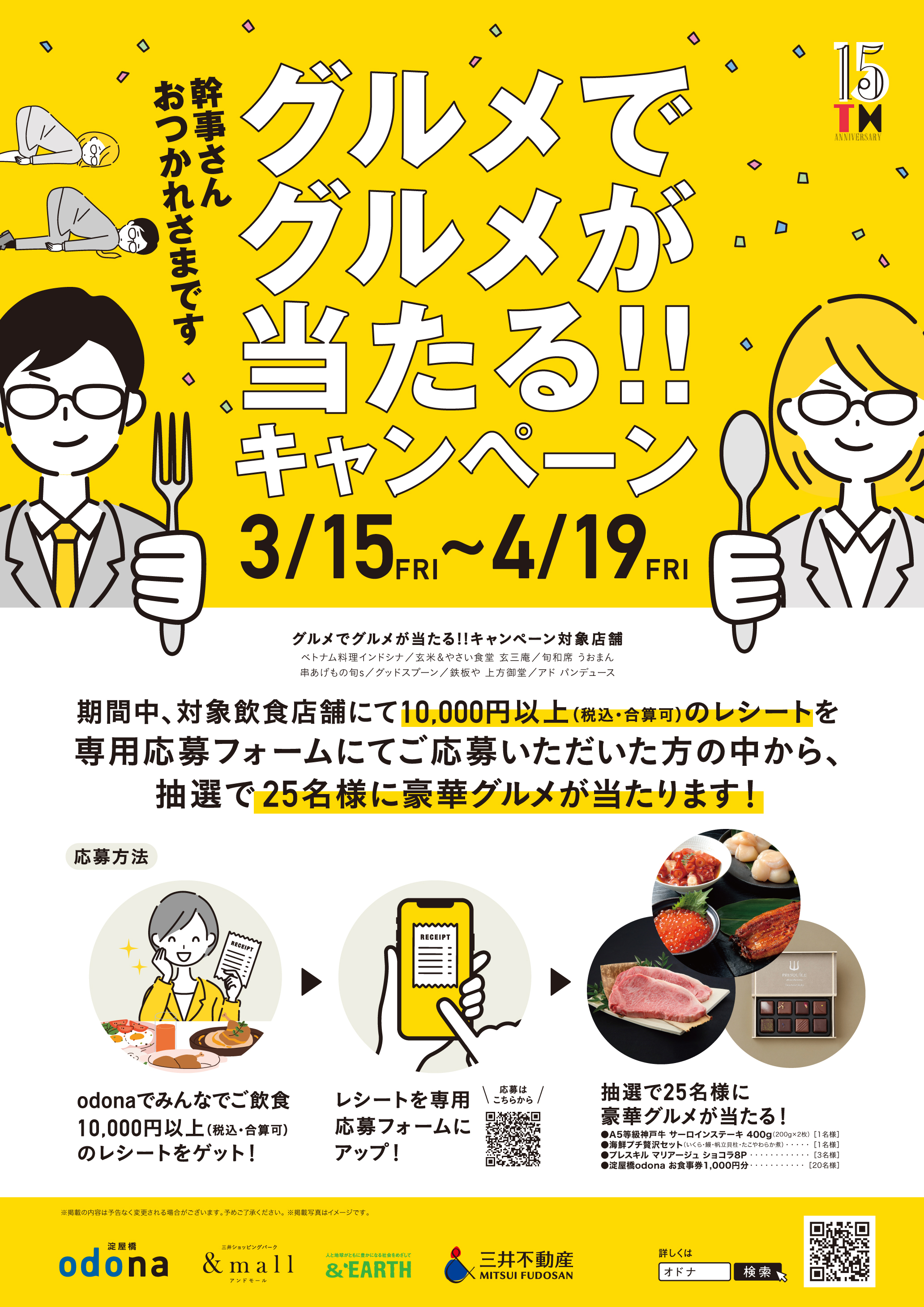 三井不動産商業マネジメント株式会社(東京都中央区)が運営する、『淀屋橋odona(オドナ)』(大阪市中央区今橋4-1-1)は、2024年3月15日(金)~2024年4月19日(金)に、「幹事さんお疲れさまです!グルメでグルメが当たるキャンペーン」を開催します。