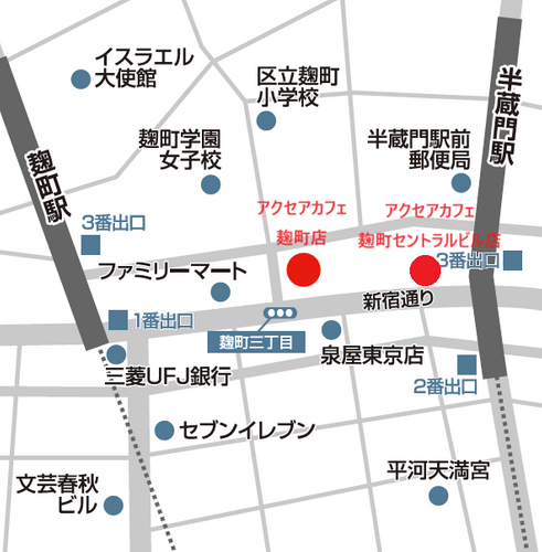アクセアカフェ麹町店は有楽町線「麹町駅」、半蔵門線「半蔵門駅」から徒歩3分のアクセスが良い好立地に御座います。