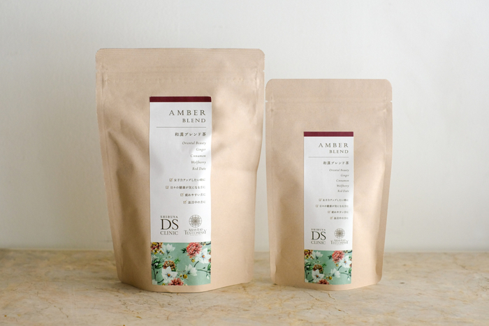 「アンバーブレンド」は、紅茶に近い味わいで甘みも感じられる東方美人茶をベースに、渋谷DSクリニックの漢方外来でも実際に処方している高品質の和漢素材から、温活中の女性にうれしい生姜、シナモン、クコの実、棗(なつめ)を漢方薬剤師がブレンドしました。