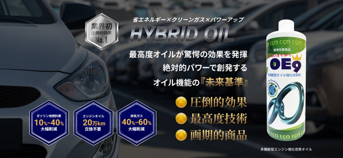 そこで、株式会社幸商業は、高騰するガソリン代に対抗し、業界初となる車の燃費向上とオイル交換無用等の大幅なコスト削減が図れるHYBRID OIL[OE9]の全国発売を開始しました。