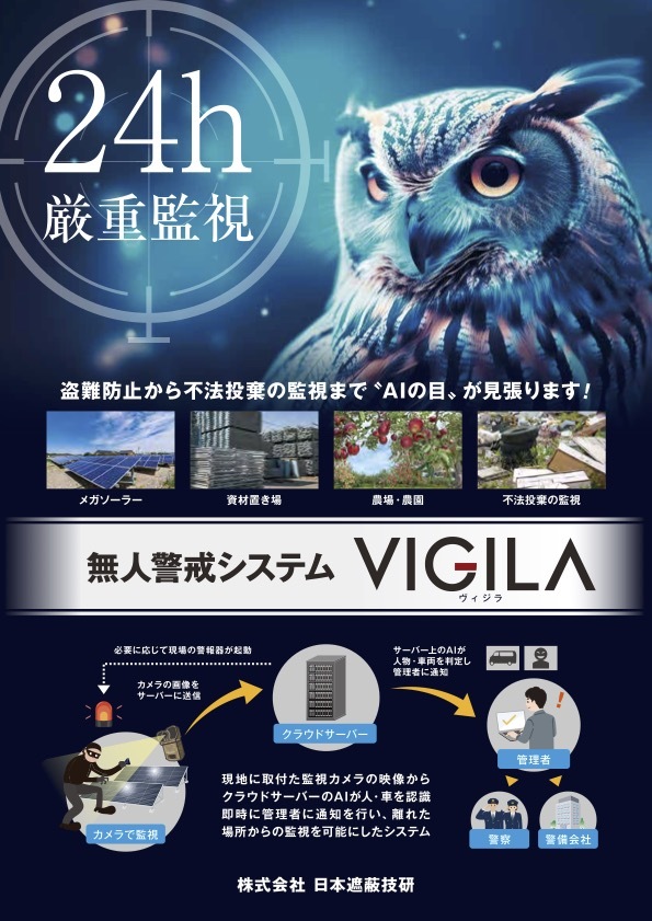株式会社日本遮蔽技研(所在地:福島県本宮市、代表取締役:平山 泉)では、夜間に大規模太陽光発電所(メガソーラー)に近づいた人間や自動車を検知し、自動的に強い光や音声を発する威嚇警報装置「Metus」を、このほど福島県内のメガソーラーに設置を完了しました。人工知能(AI)を使った当社サービス、「無人警戒システムVIGILA(R)(ヴィジラ)」と連携して作動する威嚇警報装置で、東信電気(神奈川県川崎市、遠藤 俊洋社長)製となります。全国のメガソーラーで銅ケーブルなどの盗難被害が相次ぐ中、盗難防止用に現場での威嚇・警報の要望が強いことから自動警戒サービスの社会実装を目指しております。