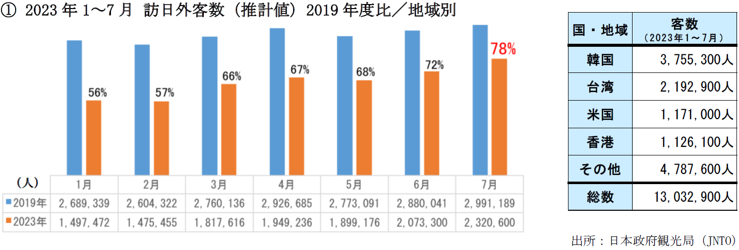 2023年1~7月のトップ3は韓国、台湾、米国。8月10日付の中国における海外旅行制限措置の撤廃に伴い、8月以降のさらなる回復が見込まれる。