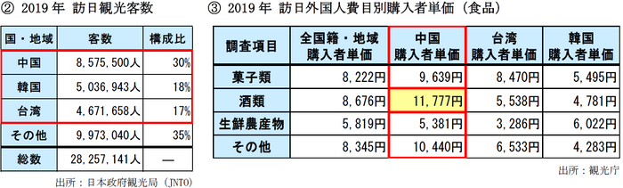 <コロナ前の国別訪日観光客数と購入単価>