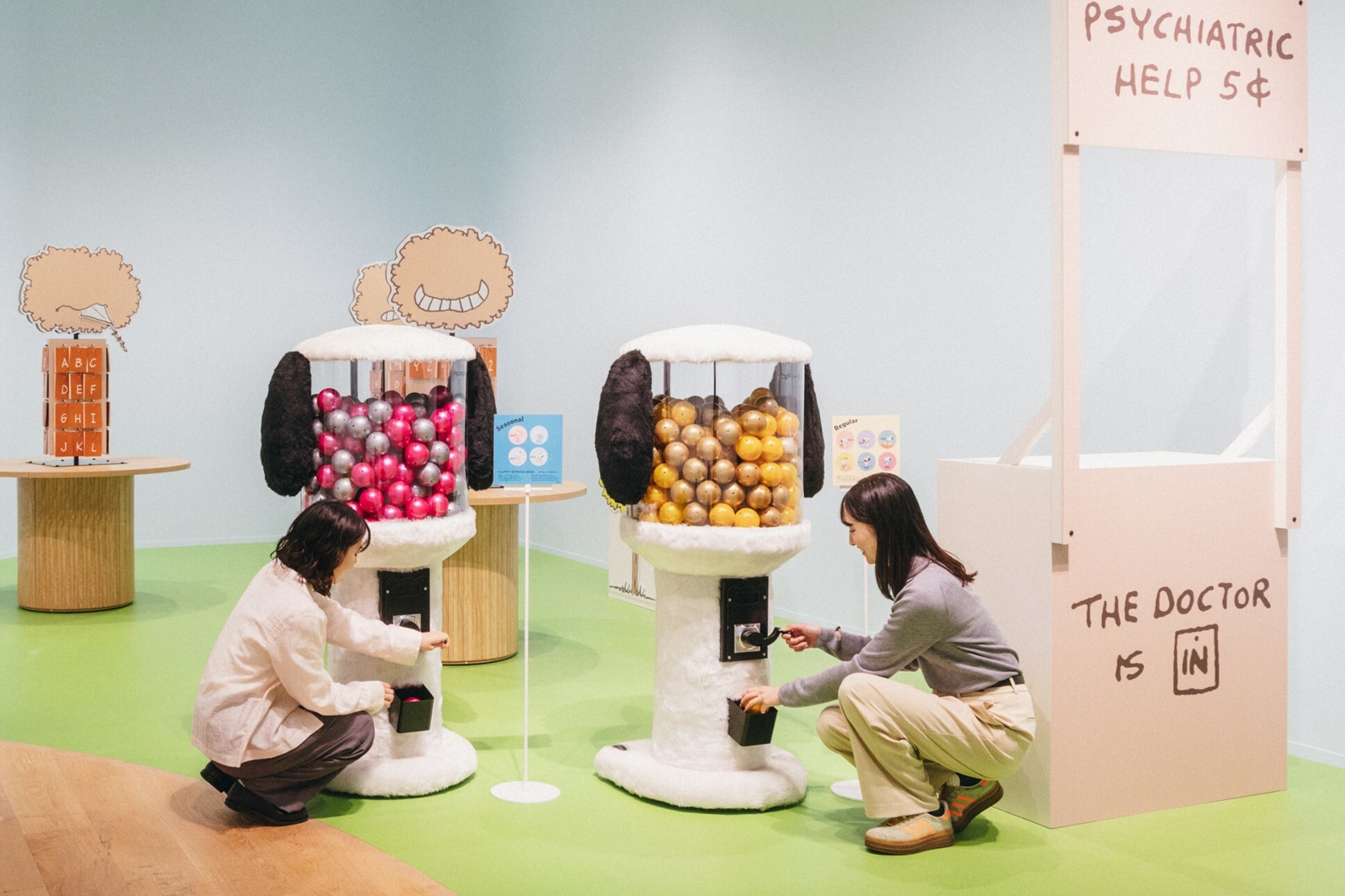 貴重な原画を鑑賞したあとは、ふかふかの広場でくつろいでください。寝転んで「ピーナッツ」のコミックを読んだり、あちこちに隠れたスヌーピーを探してみたり。「スヌーピーの缶バッジワークショップ」も毎日開催します。なんと、ふかふかスヌーピーのカプセルマシンまで登場!「ピーナッツ」の世界観に入り込んで、ワークショップを楽しめる空間になりました。