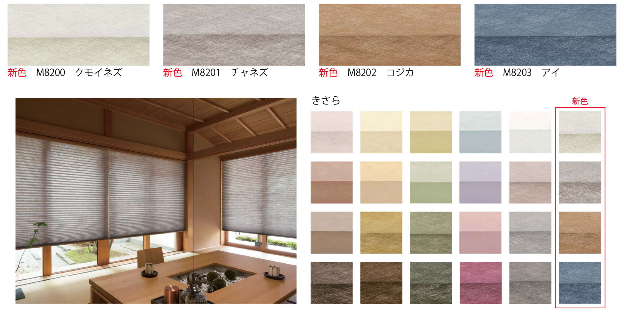 ニチベイ、プリーツスクリーン「もなみ」で人気の 和紙調生地『きさら』に、新色4色を追加!7月19日より発売