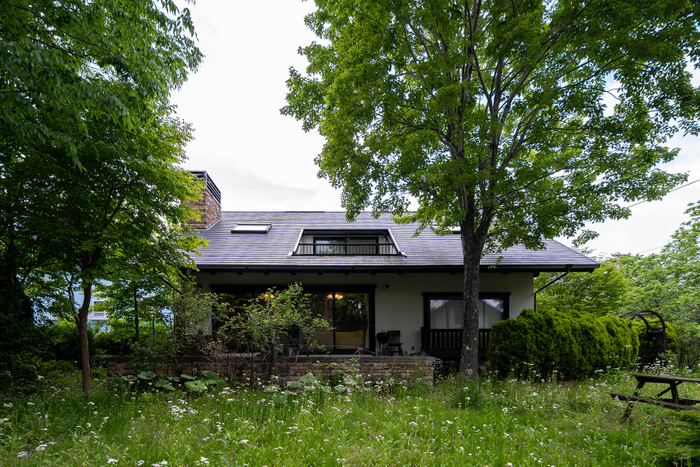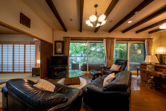 本施設は、2階建ての3LDK(約202㎡)の一戸建てで、大人数でも楽しめる本格的暖炉を備えたリビングダイニング(30帖超)と大自然の中でアウトドア気分が思う存分楽しめる広いウッドデッキが特徴的です。さらに、続き間の和室8畳、シャワールーム、玄関から和室につながる土間スペースなど、随所にオーナーのこだわりが散りばめられています。2階は南向きで、天窓を備えた日当たりのよい主寝室とゲストルーム、浴室が配置されています。さらに書斎スペースも二か所完備しているのでリゾートでくつろぎながら働くワーケ―ションにも最適な別荘となっています。