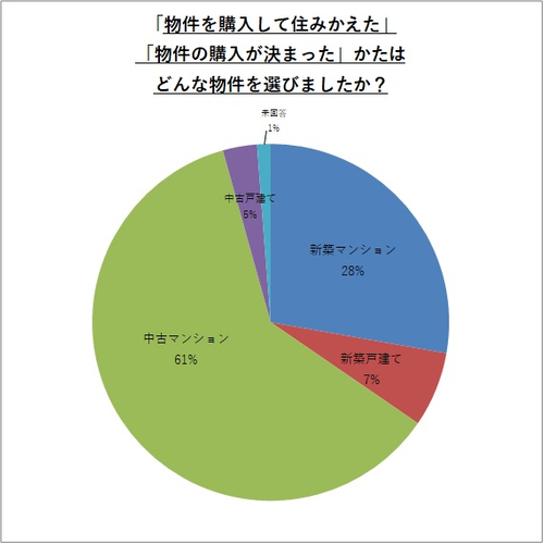 ・物件購入者(162人)が買った物件は、「中古マンション」が約61%(99人)、次いで「新築マンション」約28%(45人)。
