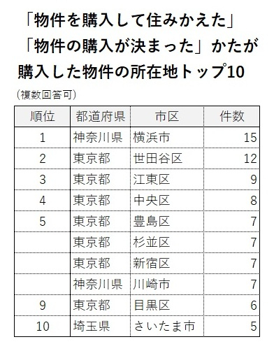 ・物件購入者が買った物件の所在地のトップは「神奈川県横浜市」。次いで「東京都世田谷区」「東京都江東区」。
