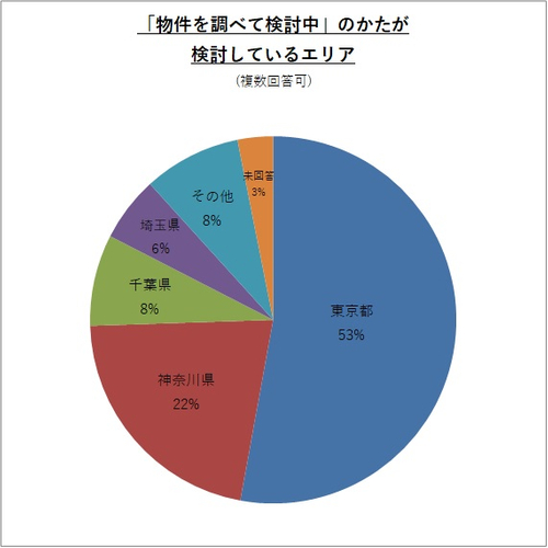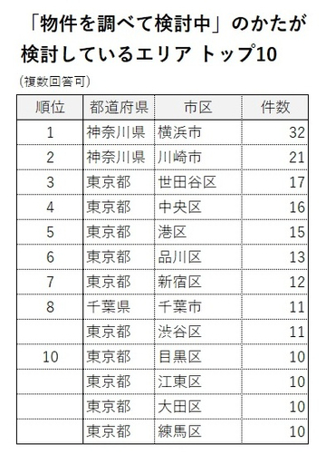 検討している物件のエリアは、「東京都内」が約53%だが、市区町村でのトップは「神奈川県横浜市」。次いで「神奈川県川崎市」「東京都世田谷区」。
