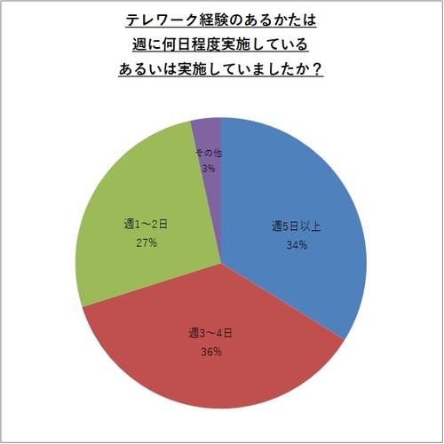 ・テレワーク経験者(733人)のうち約70%(514人)は、週3日以上の実施。