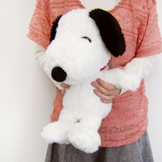 手に持ったらこんな感じになります。先ほど紹介したスヌーピーと比べると、大きいことが分かりますよね..。抱きしめた時に感じる重量感が並ではありません。小さなお子さまだったらスヌーピーの上にきっと座れますよ。自宅にこのスヌーピーがいたら、愛着が湧いて手放せなくなっちゃいますね〜♪