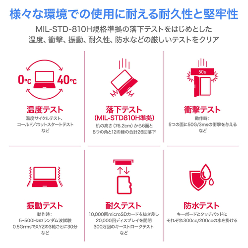 耐久性に優れた設計で、持ち運びに最適。MIL-STD-810H規格準拠の落下テストに合格し、さらに温度、衝撃、振動、耐久性、防水などに関する各種の厳しいテストをクリアしています。日常の衝撃や振動も問題ありません。