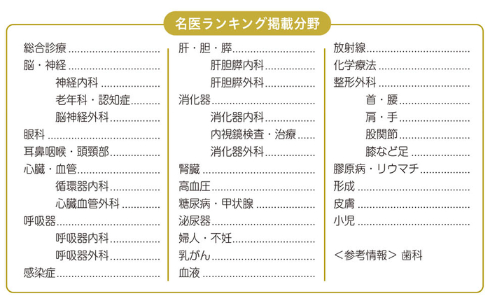 総合診療/神経内科/老年科・認知症/脳神経外科/眼科/耳鼻咽喉科/頭頸部外科/循環器内科/心臓血管外科/呼吸器内科/呼吸器外科/感染症/肝胆膵内科/肝胆膵外科/消化器内科/内視鏡検査・治療/消化器外科/腎臓/高血圧/糖尿病/甲状腺/泌尿器/婦人/不妊/乳がん/血液/放射線/化学療法/整形外科/膠原病・リウマチ/形成/皮膚/小児/<参考情報>歯科