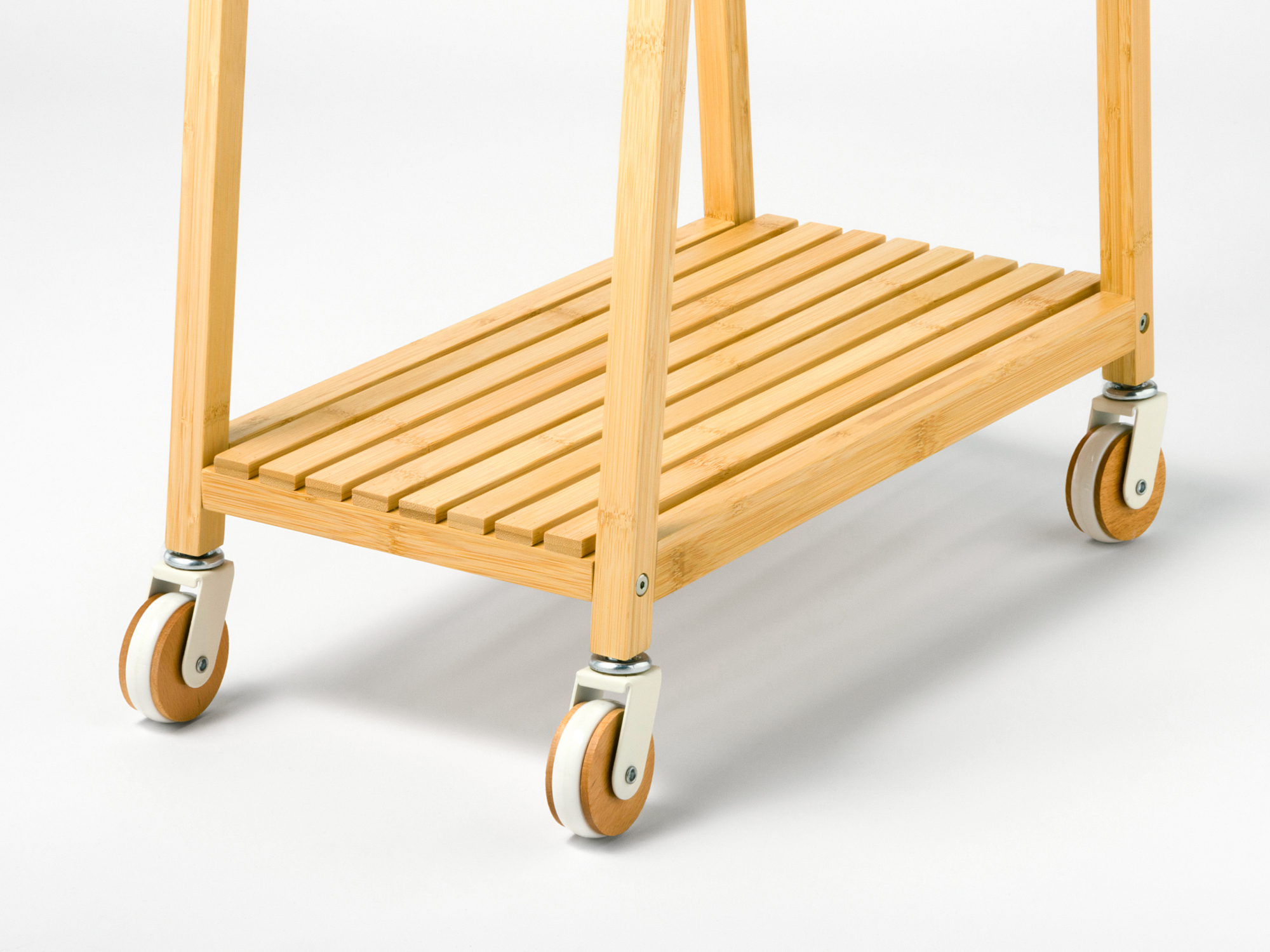 ナチュラルな木製キャスターを採用