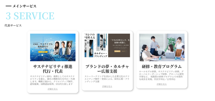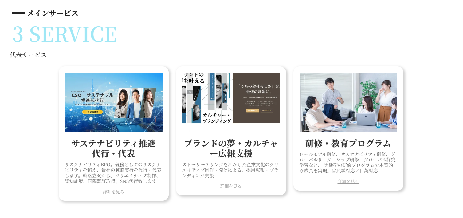 弊社の3つの代表的なサービスを一目で理解いただけるよう、トップページに配置しました。