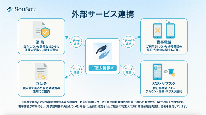 「SouSou」はマイナンバーカードを活用した新しいデジタル終活サービスです。エンディングノート等の終活に必要な様々な機能を、アプリ利用料完全無料・ワンストップで提供します。また従来のサービスにはない「①本人性/真正性の担保」・「②逝去判定のデジタル化」・「③外部サービス(データ)連携」という3つの特徴を備えており、今後は様々なパートナー企業との連携を通じて、ご逝去後の各種手続きの自動化・簡略化を目指します。