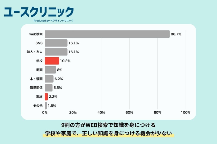 ペアライフクリニックが2025年2〜3月に来院者274名を対象に実施した意識調査でも、性感染症の情報を「WEB検索」で得ていると答えた人は88.7%に達しました。「学校から教わった」は10.2%、「家庭から教わった」はわずか2.2%にとどまっています。