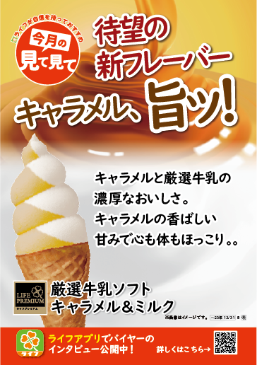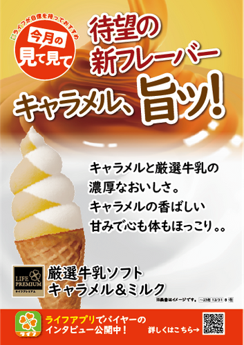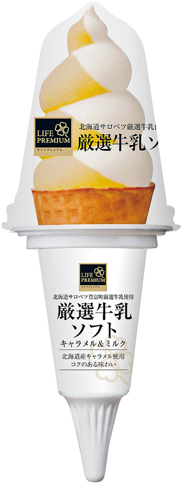 “おいしい” “ワクワク” “ハッピー” をお届けするライフコーポレーションは、「ライフプレミアム サロベツ豊富町厳選牛乳」を使用した人気の“厳選牛乳ソフトシリーズ”から、この冬限定で「ライフプレミアム 厳選牛乳ソフトキャラメル&ミルク」を、12月1日(金)に新発売いたしました。