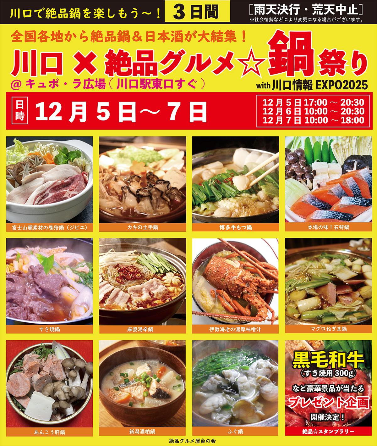2025年12月5日(金)~7日(日)は、川口駅前キュポ・ラ広場で、全国各地から集結するアツアツの「絶品☆鍋」を堪能しよう!