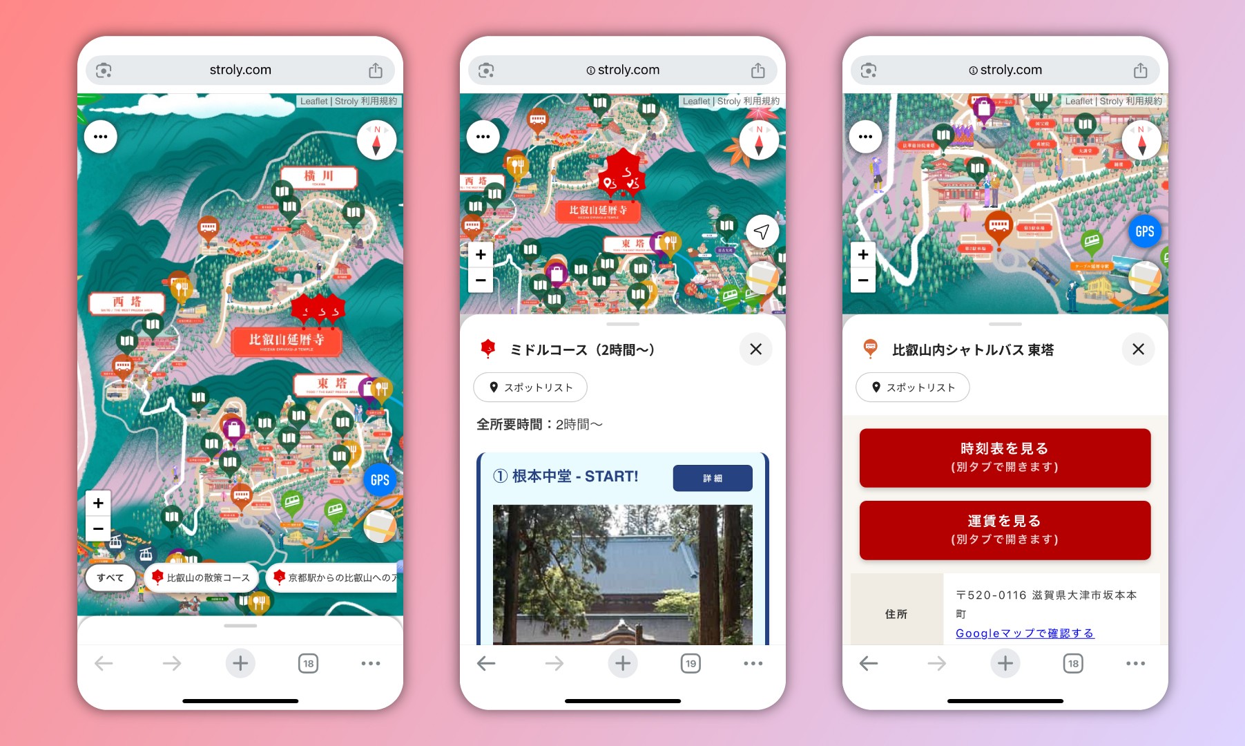 マップはスマートフォンのGPS機能と連動しており、広大な比叡山・びわ湖エリアにおいても、現在地をイラストマップ上に正確に表示します。これにより、観光客の皆さまは迷うことなく、安心して次の目的地へ進むことができます。