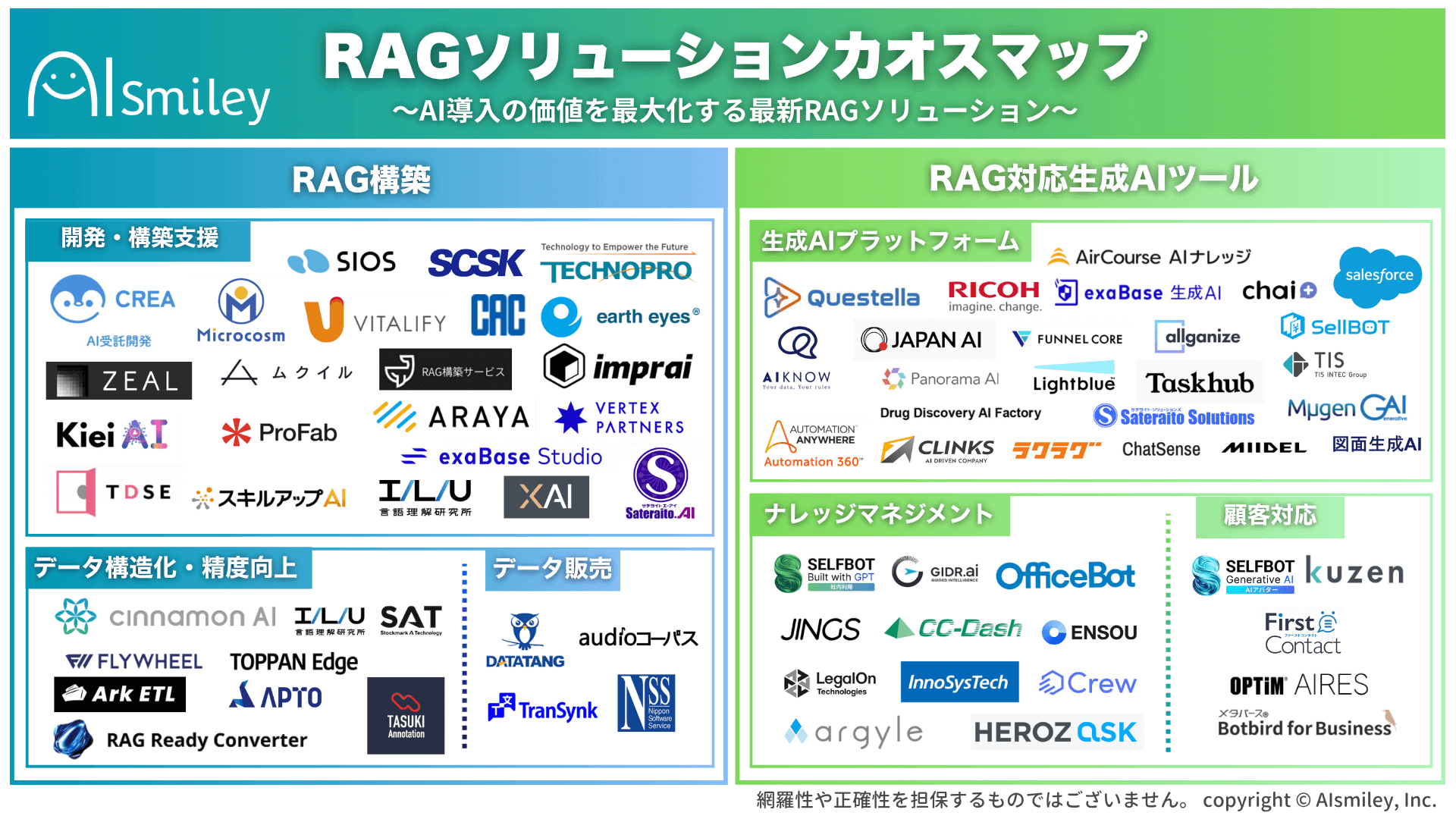 RAGソリューションカオスマップは、企業の導入検討をサポートするために、用途別に国内のRAGソリューションを整理・掲載したものです。