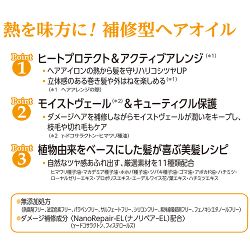 熱を加えることで髪のダメージに反応しキューティクルを補修・保護する美容成分と、髪にうるおいを与える美容成分のなかでも、熱に強い成分を厳選し配合しました。ミストやオイルそれぞれの形状に適した配合と、ベースとなる植物由来の成分が、髪にツヤとうるおいを与え、理想の髪質に近づけます。
