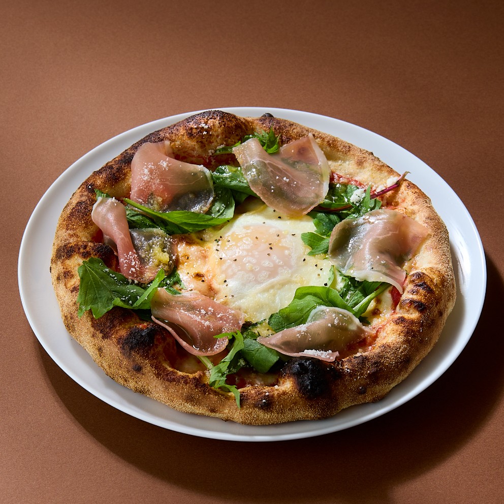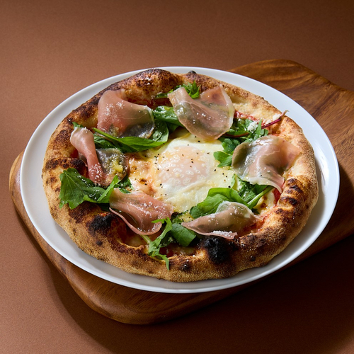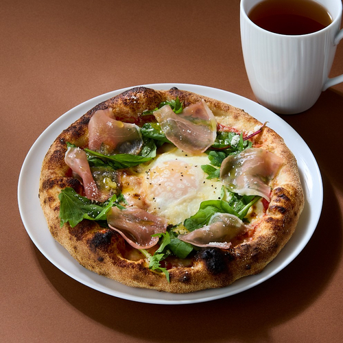 北海道日高地方新冠町にある直営農場の「平飼いたまご」がとろりととろける新作ピザは、ご注文を受けてから手伸ばしした生地を高温窯で焼き上げることでふっくらもちもちの生地が叶うこだわりのひと品。北海道産モッツァレラチーズとピザに合うように厳選したトマトを使用し、ベビーリーフと生ハムを飾った季節限定の贅沢な味わいです。