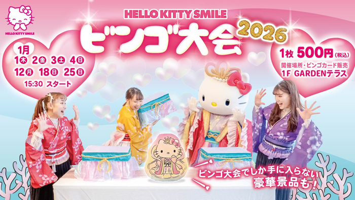 まず、GARDENテラスでは、ハローキティがHELLO KITTY SMILEのオリジナル楽曲に合わせてダンスを披露する スペシャルステージ『スマイルビンゴ大会』を1月1日(木)より開催。お客様参加型のビンゴ大会となっており、ビンゴが成立した先着3名様には、乙姫の衣装や人魚の衣装を着たハローキティの限定マスコットキーホルダーなどをプレゼント!さらに、参加者全員に参加賞をご用意した“ハズレなし”のイベントです。