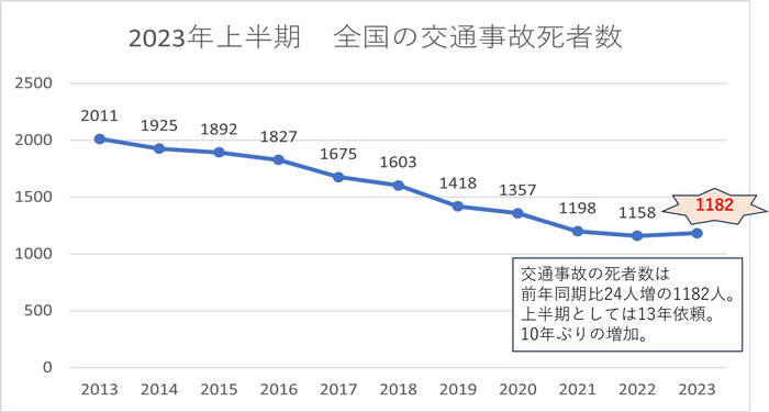 2023年7月の警察庁の発表によると、上半期(1-6月)の全国の交通事故死者数は1,182人で、2013年より10年ぶりに増加に転じました。