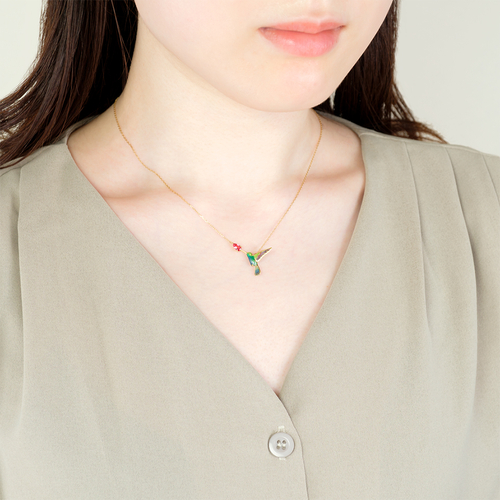 このほどの新作は、“幸せを運んでくれる”と言われるハチドリを七宝の技法を用いて繊細に表現したネックレスです。透け感のあるみずみずしい色彩が夏の素肌に映え、胸元を涼やかに彩ります。