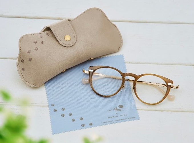 専用ケースとメガネ拭きを付属しており、ケースの表面には足跡、背面にはメインビジュアルに使用している香箱座りの猫をプリントし、猫耳が立ったようなシルエットにしています。