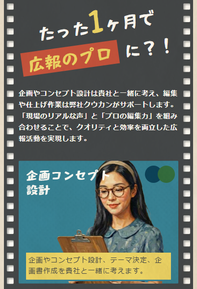 Recruitiveは、単なる採用業務の代行サービスではなく、企業の魅力を正しく伝え、応募や認知拡大につなげるための採用支援サービスです。クウカン株式会社がこれまで培ってきたWebマーケティング、コンテンツ設計、動画制作、Web制作の知見を活かし、採用活動を「募集業務」で終わらせず、「企業価値を伝える広報活動」として支援できる点も大きな強みです。