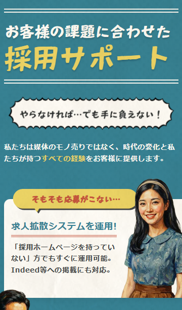 求人情報だけでは伝えきれない企業の魅力や働く人の想いを発信し、共感を軸とした採用活動を支援します。職場の雰囲気や価値観、仕事のやりがいを丁寧に言語化・可視化することで、応募数の増加だけでなく、マッチ度の高い採用につなげます。条件面だけに頼らない採用活動を実現したい企業に向けたサービスです。