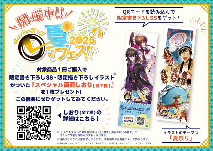 また、夏フェス開催を記念したオリジナル図書カードが当たるプレゼントキャンペーンや、2025年にTVアニメが放送される『とんでもスキルで異世界放浪メシ』と『追放者食堂へようこそ!』の両面うちわがもらえるフェア、さらにはオーバーラップ12周年フェアも同時に開催。