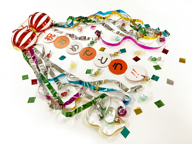 お菓子と一緒に、キラキラなメタル吹雪もたっぷり入っていて、くす玉を割ると華やかに舞い散ります。小さいけれど、みんなで楽しくハッピーになれる「お菓子なくす玉」を、是非ご利用ください。