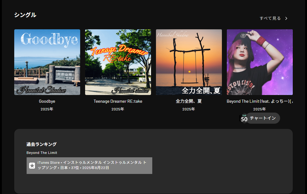 「Step on it」がリリース当日の9月3日のiTunes Store アメリカでj-popチャート初登場100位以内の快挙をあげているのですが、Tune Core Japan の「Hannibal Shadow」のartist pageを確認したところ、デビューアルバムの前にリリースされた「Beyond the limit (feat.よっちー)」が iTunes Store • インストゥルメンタル インストゥルメンタル トップソング • 日本 • 37位 • 2025年8月22日と記載されていました。