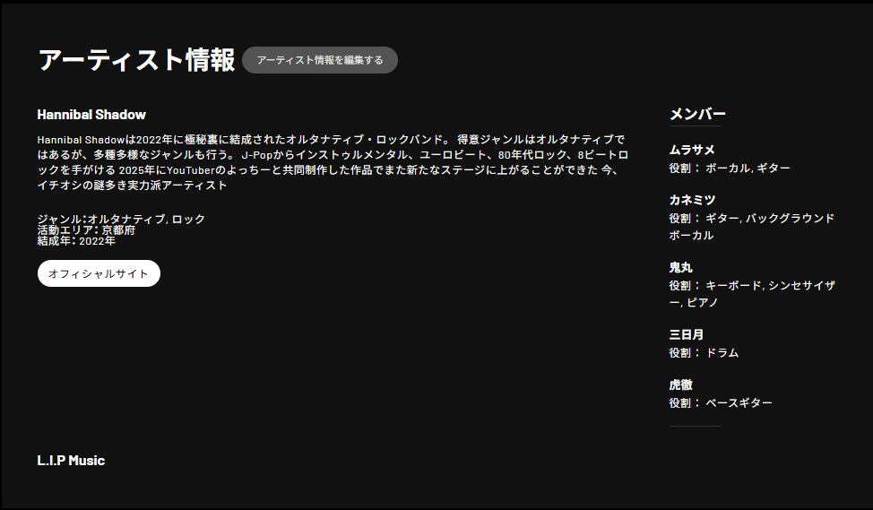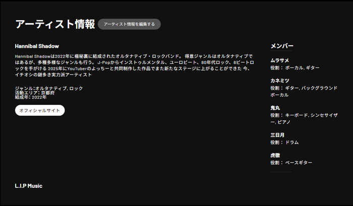 ビジュアル、メンバーの情報、その他全ての露出完全NGの「Hannibal Shadow」ですが、実はほんの少しだけTune Core Japanのアーティスト紹介ページに情報が載っていました。