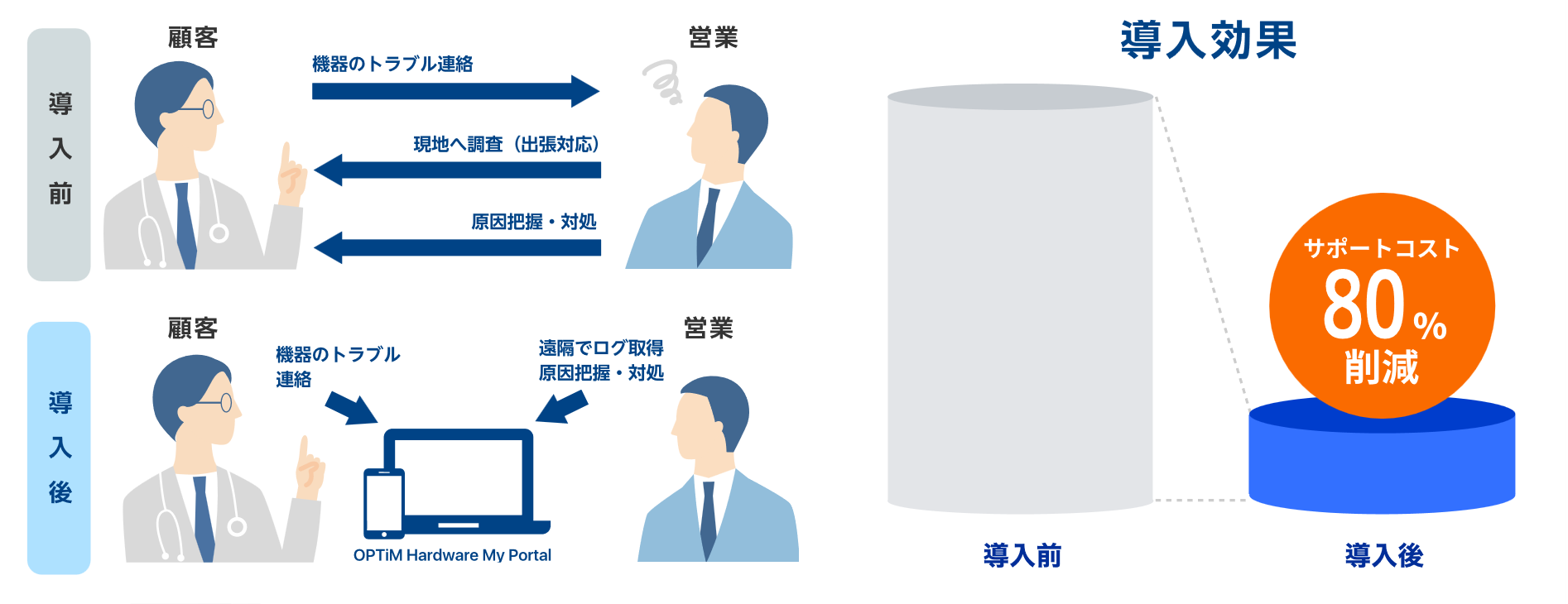 トプコンメディカルジャパンはこの導入により、眼底検査機器の保守業務において、遠隔でのログ取得やトラブル対応を実現しました。その結果、従来必要だった現地出張業務の約80%を削減することに成功しました。