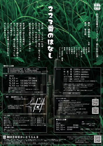 劇団芝居屋かいとうらんま主催、第63回本公演『223番のはなし』が2025年10月10日 (金) 〜 2025年10月12日 (日)に下北沢 OFF・OFFシアター(東京都 世田谷区 北沢 2-11-8 TAROビル3F)にて上演されます。 チケットはカンフェティ(運営:ロングランプランニング株式会社、東京都新宿区、代表取締役:榑松 大剛)にて2025年8月23日(土) 00:00~予約受付開始です。