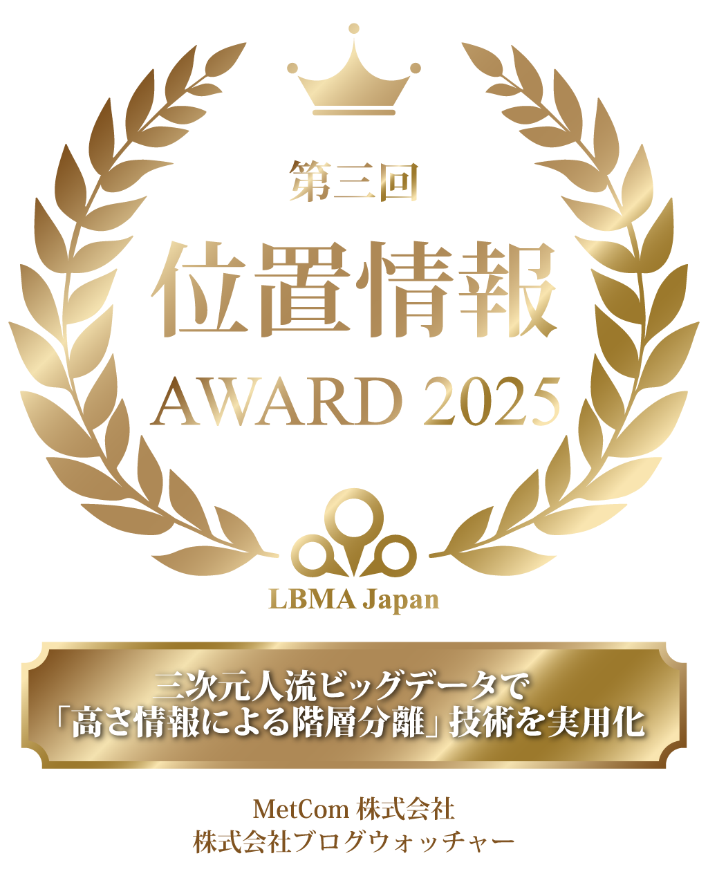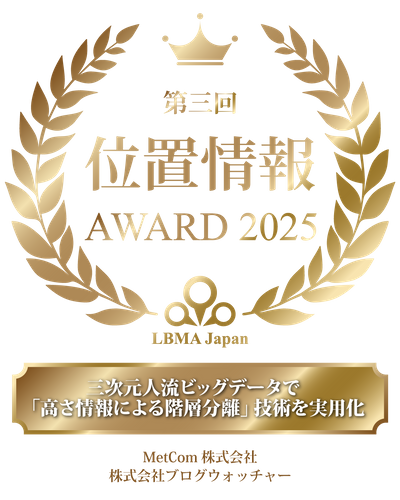 三次元位置情報サービスを提供するMetCom株式会社(本社:東京都港区、代表取締役社長:近義起、以下「MetCom」)は、位置情報データの収集・分析・活用サービスを提供する株式会社ブログウォッチャー(本社:東京都港区、代表取締役社長:新村 生、以下「ブログウォッチャー」)と共に、一般社団法人LBMA Japan主催の「第3回 位置情報アワード2025」にて、最優秀賞を受賞しました。