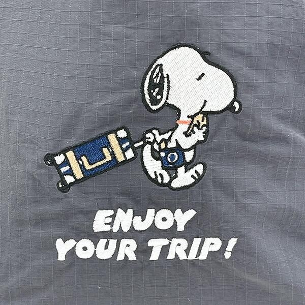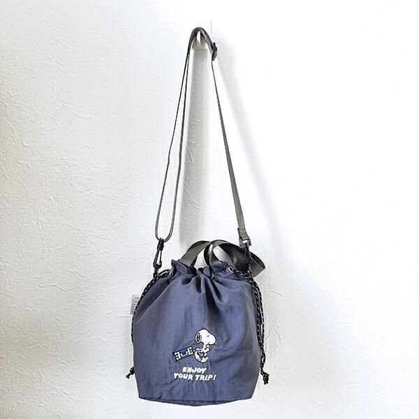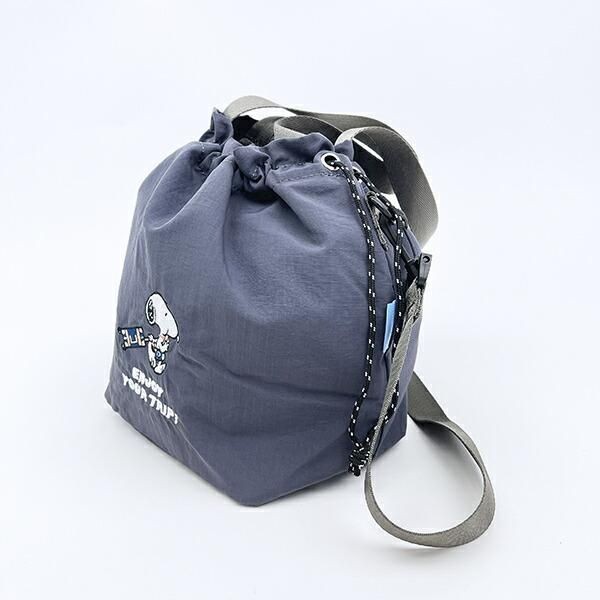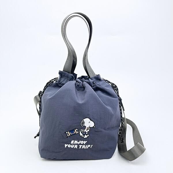まずご紹介するのは、「スヌーピー enjoyyourtrip 巾着ショルダーバッグ」です。サイズは、25cm×32cm×5cm。巾着ショルダーバッグとしても、巾着ポーチとしても使える、2WAYアイテムとなっています。