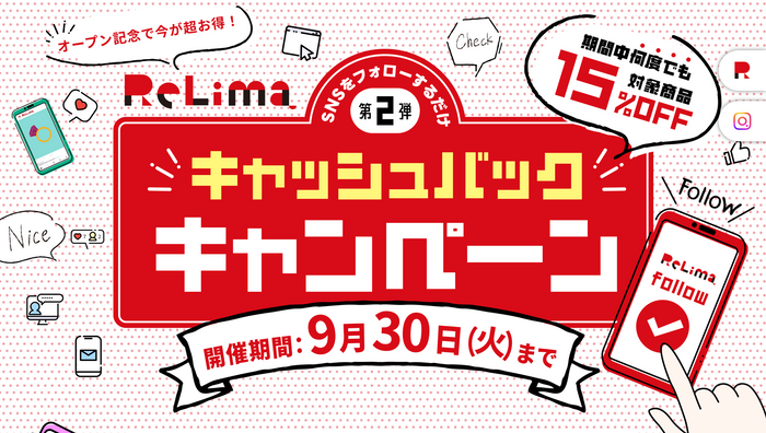 リユース専門オンラインマーケットプレイス「ReLima(リリマ)」(株式会社ヒバナテクノロジー運営、所在地:東京都港区西麻布・代表取締役:西谷 真一)で開催中の「キャッシュバック」キャンペーンは、当初8月31日までの予定でしたが、ご好評につき9月30日までの延長が決定しました。