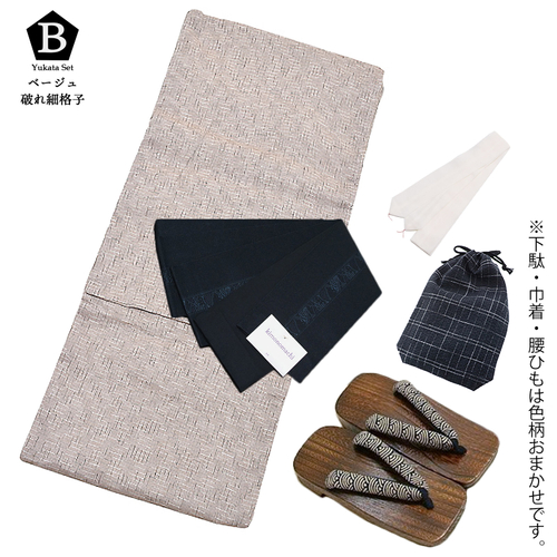 Bベージュ破れ細格子…浴衣:ベージュ地に細かな破れ格子模様 帯:白鼠色の波柄