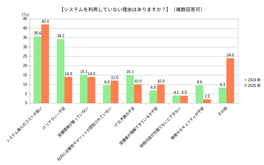 システムを利用していない理由として最も多かったのは、『システム導入のコストが高い』の42%で、2024年と比較して6.4%増加していることがわかりました。また、2番目に多い理由である『ITリテラシー不足』と、1位の『システム導入のコストが高い』との差は、1.4%から28%に広がっていることがわかりました。
